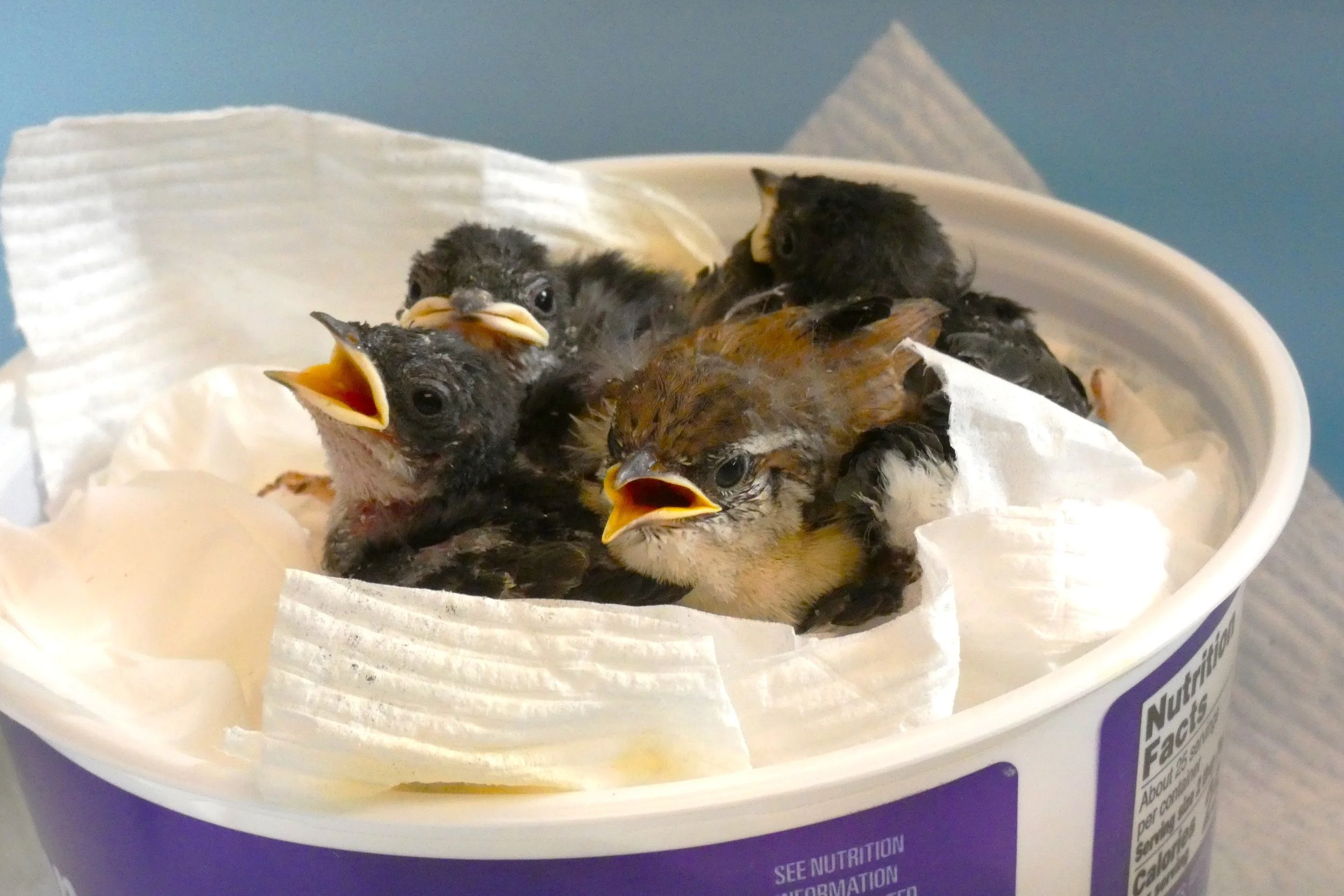 These babies need to be brought to a rehabilitator for evaluation and care. They may have sustained injuries in the fall, and the parents may have been killed or scared away. Bring the branch or section of tree to Tri-State or another licensed rehabilitator as soon as possible. If the nestlings are not injured, it may be possible to place them into a foster nest of the same species. If no foster songbird family is available, the rehabilitator will care for the babies until they are old enough to be released.