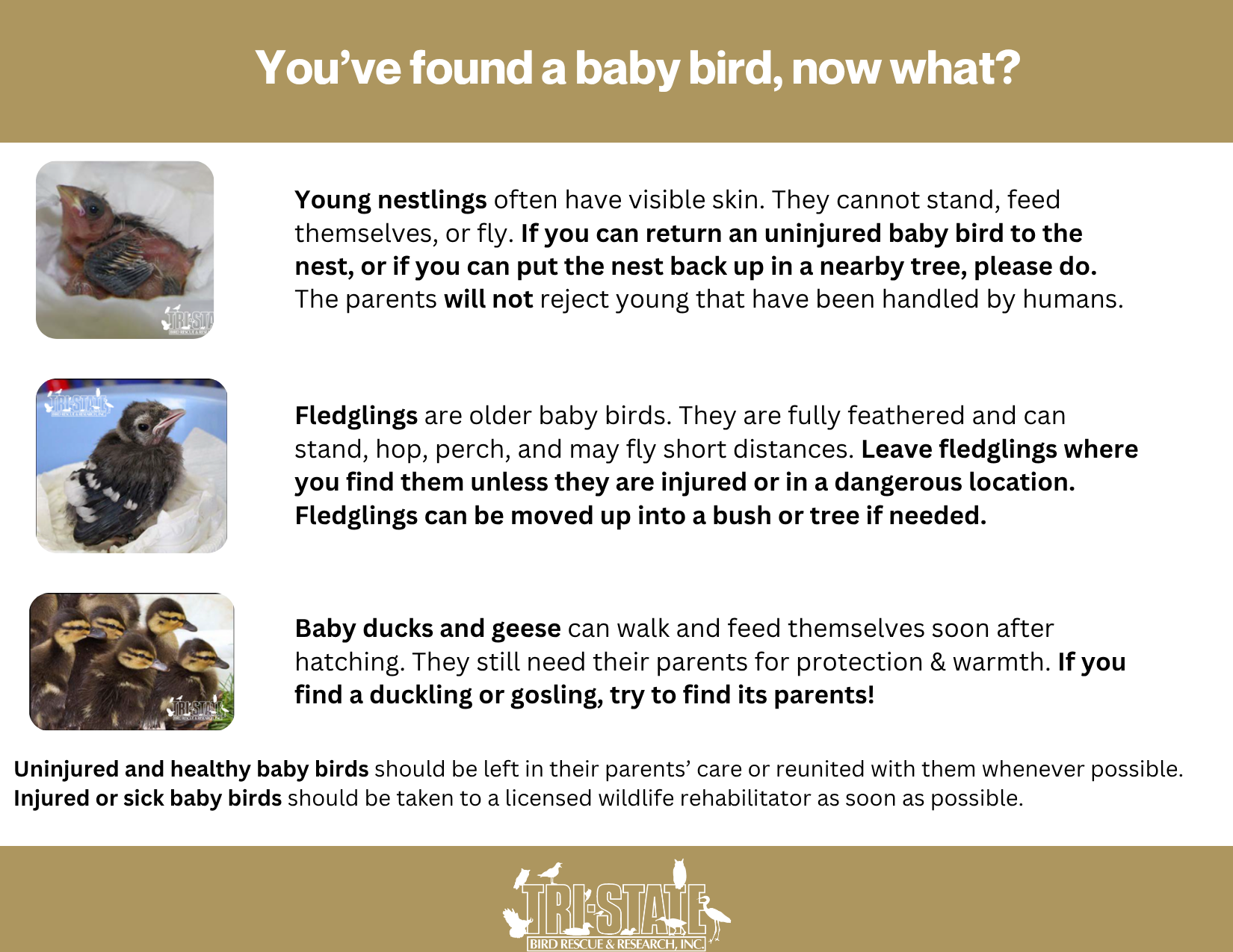 If you find a downy or partially feathered baby that lies on their belly rather than stands, you have probably found a “nestling,” a bird that is too young to be out of the nest. This bird should be checked for fall-related injuries and evaluated for renesting by a licensed wildlife rehabilitator. Contact Tri-State Bird Rescue & Research or another rehabilitator for assistance.